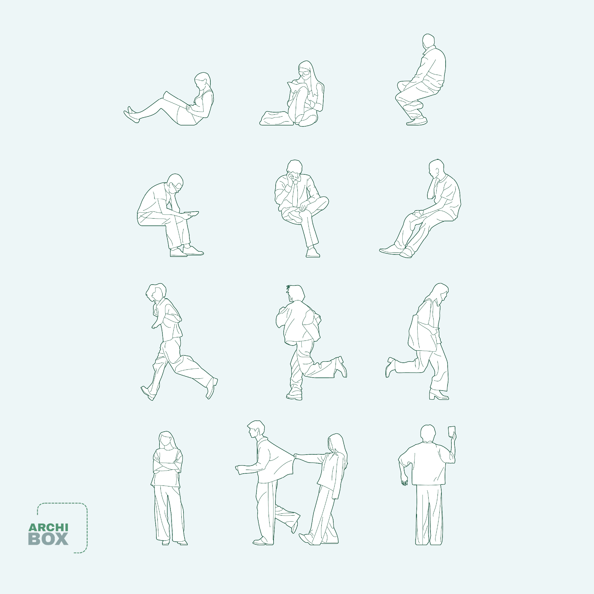 The People Collection includes a range of human figures shown in various poses and activities, carefully scaled for architectural drawings. These figures help bring context and liveliness to spaces, making your plans, sections, and elevations feel more human and relatable.